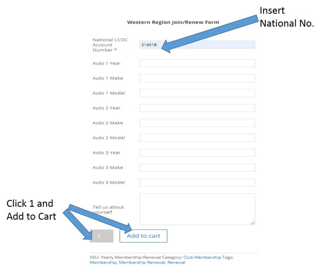 Enter your LCOC National membership number at the top of the form and follow the prompts. If you don’t know your number contact us at westlcocmembership@yahoo.com for assistance. As you complete the form you will need to select 1 membership and add it to your cart.