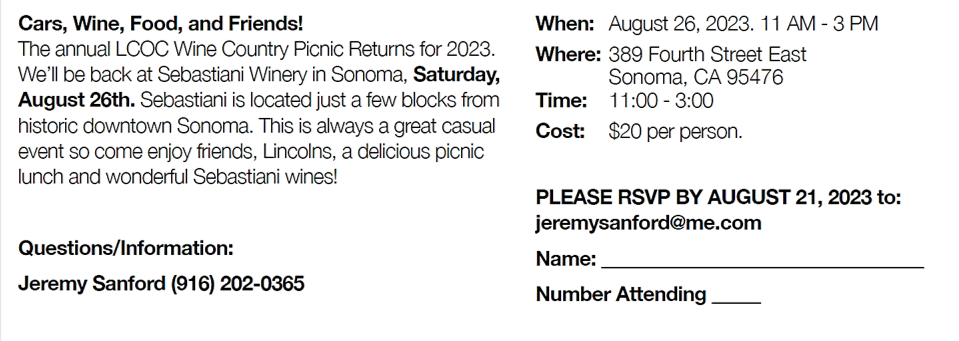 Sebastiani is located just a few blocks from historic downtown Sonoma. Just getting there is half the fun, as the drive through the beautiful wine country is a delight. The $20 price includes tire kicking, optional wine tasting on or own and a delicious picnic lunch with wonderful Sebastiani wines! Feel free to bring your classic Lincoln for our members to enjoy before the picnic or just rumble in with your newer vehicle of choice.