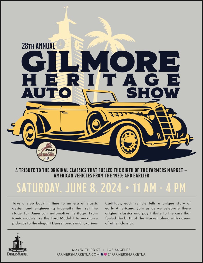 I am pleased to invite you to the 28th Annual Gilmore Heritage Auto Show, 6333 W. Third St., Los Angeles, on Saturday, June 8. The Original Farmers Market is celebrating its 90th Anniversary so this year’s theme is: