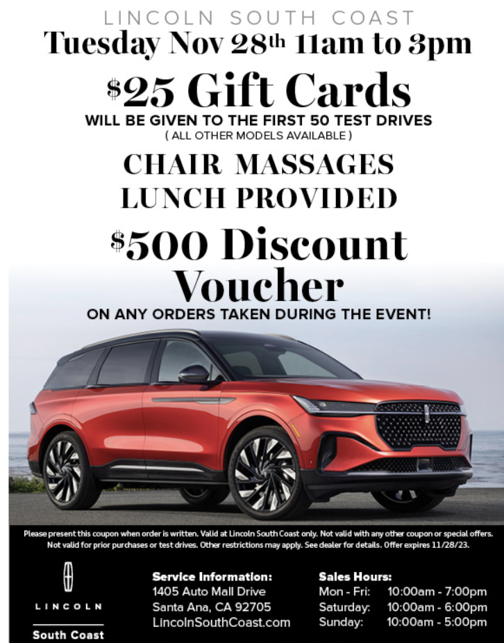 LIncoln Motor Company and the Lincoln South Coast dealership are joining forces for a special event this Tuesday Nov. 28 for a gala introduction of the the brand new 2024 Nautilus and we’re invited!. Why not bring your classic Lincolns or your everyday drivers and be part of the fun?