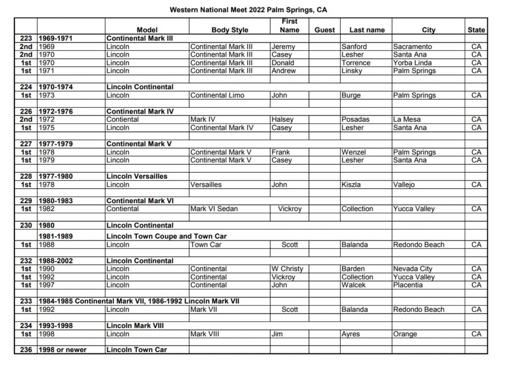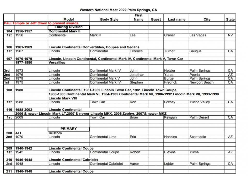 LCOC newcomer Stephen Fredrick received the award for the Best Touring Lincoln for his 1975 Mark IV, with only 16,000 original miles. Photos of Lincoln Trophy, Senior and Emeritus class winners and their cars will be run in future Lincoln and Continental Comments magazines.