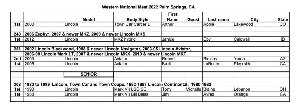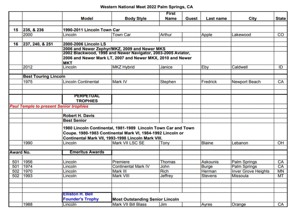 Four Emeritus and 2 Senior Trophies were awarded to some of the best Lincolns in LCOC. Tony Blaine won the Robert H. Davis trophy for his 1990 Mark VII LSC SE, while Jim Ayres received the Elliston H. Bell Founders Trophy for his 1988 Mark VII Bill Blass, judged the best Senior car in the show.