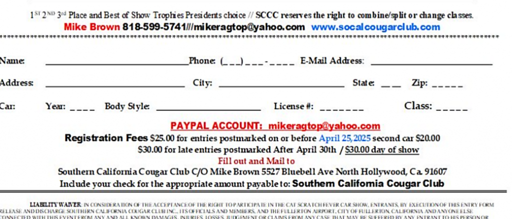 LCOC to Join with the SoCal Cougar Club for May 3 Show; Save $$$ with Early Registration by April 30