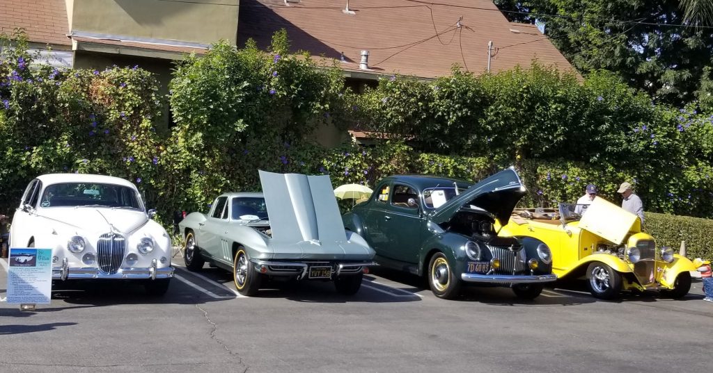 Vehicles included a trio of Austin Healeys, a custom Cadillac, a 1953 Ford, and an elegant 1962 Jaguar sedan complete with a red rose and Grey Poupon mustard on a rear seat shelf, Corvette, a Ford truck and some hot rods.