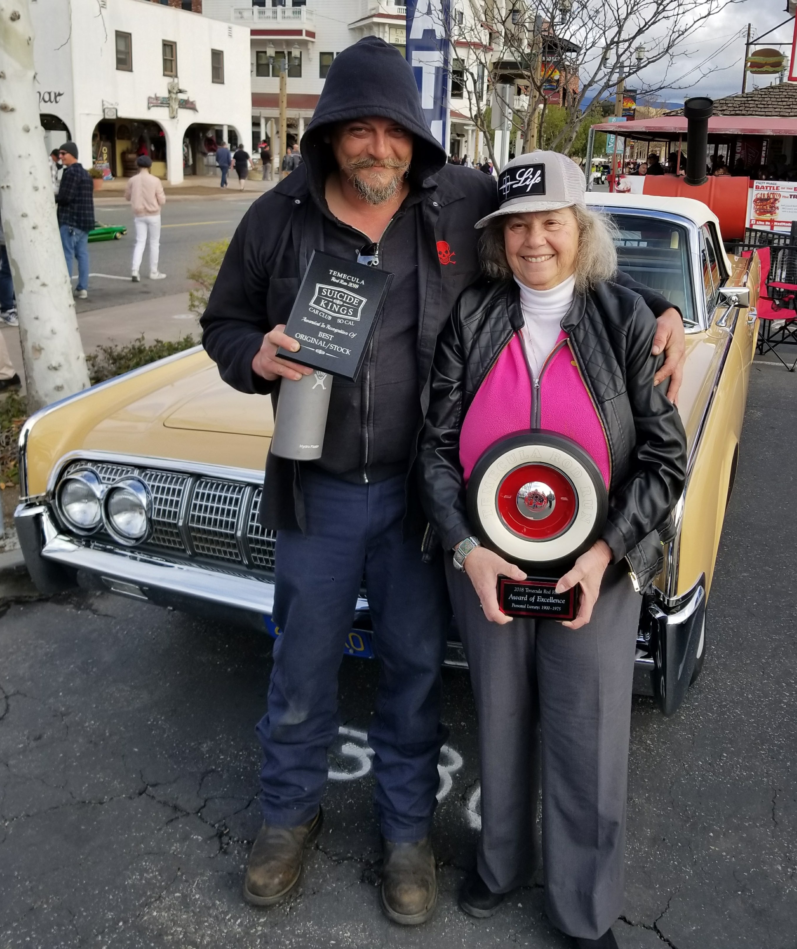 Numerous prizes were awarded in various classes by officials of the Rod Run. Elayne is fortunate to have received the award of excellence for the Outstanding Personal Luxury Car 1900-1975, for her ’64 Continental convertible, duplicating the feat of Jim Ayres who won the same prize last year for his Regal Turquoise 1964 Lincoln convertible. The Suicide Kings held their own meet within a meet and voted Elayne’s car the best original/stock vehicle among their group.