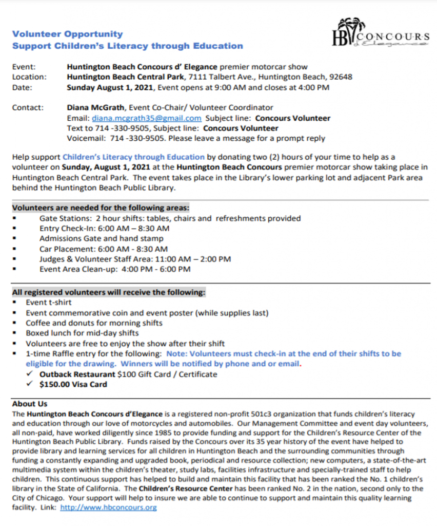 Volunteers are needed to help with the Huntington Beach Concours, one of LCOC’s most popular annual events, even as registration is closing July 23 for exhibitors. Volunteers will receive special rewards and be eligible for a drawing for valuable gift cards. See form below for details.